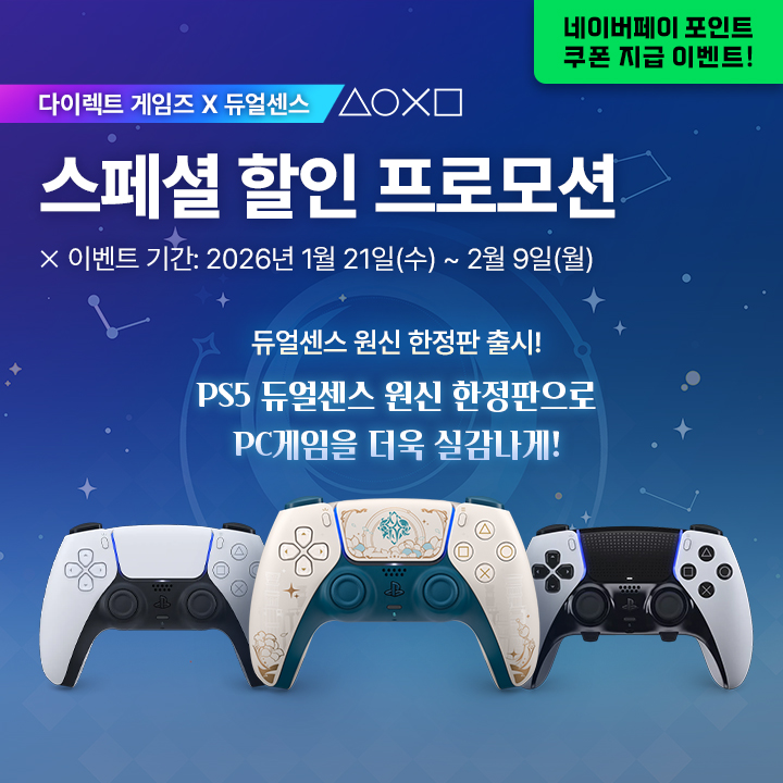 • 이벤트 내용: 이벤트 기간 내 다이렉트 게임즈에서 <듀얼센스 무선 컨트롤러 - 원신 한정판> 구매 시, 네이버페이 포인트 쿠폰 지급 (주문 건당 1회 제공)
