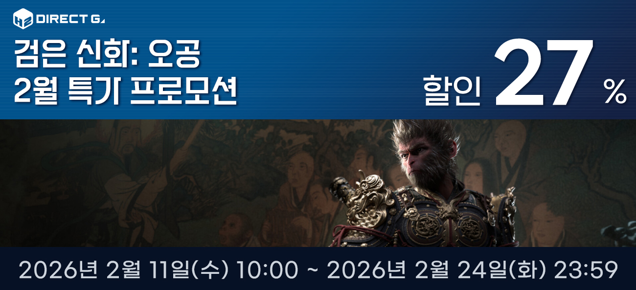 ■ 검은 신화: 오공 2월 특가 프로모션 • 내용: 다이렉트 게임즈 인기 타이틀 <검은 신화: 오공> 할인 판매 • 기간: 2월 11일(수) 10:00 ~ 2월 24일(화) 23:59까지 ※ 프로모션 기간과 할인율, 품목은 사정에 따라 사전 공지 없이 변경될 수 있습니다.