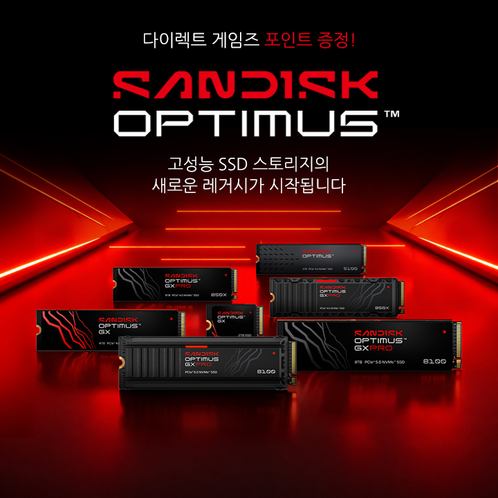 게이머 여러분께 사랑받았던 WD_BLACK SN850X, 8100 등 독보적인 성능의 라인업이 이제 Sandisk Optimus라는 새로운 이름으로 여러분을 찾아갑니다! 압도적인 스피드와 안정성은 그대로, 브랜드는 더욱 강력하게! 오는 4~5월 출시될 Sandisk Optimus를 기다리며, 다이렉트 게임즈와 함께하는 특별한 프리 런칭 이벤트를 즐겨보세요.