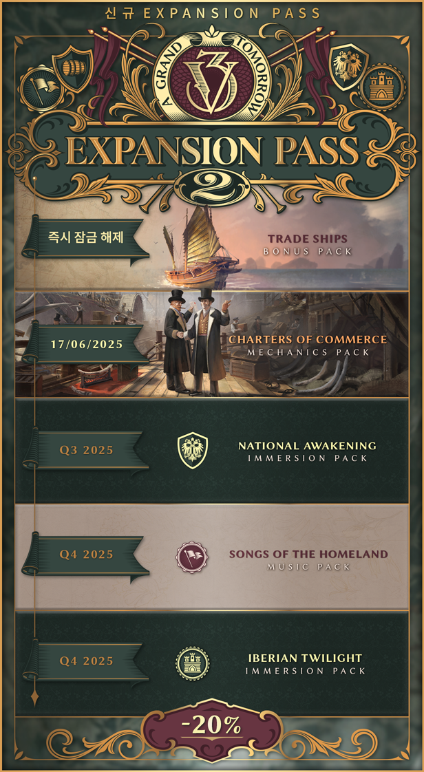 빅토리아 3가 제공하는 경험을 그랜드 에디션으로 만끽해보세요. 그랜드 에디션은 기본 게임 및 다음이 제공되는 확장팩 패스로 구성됩니다.