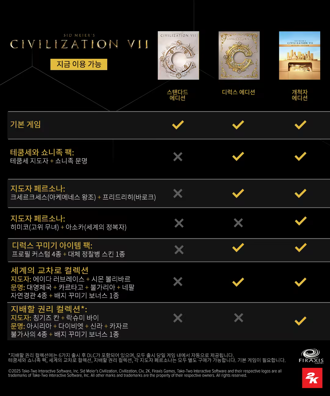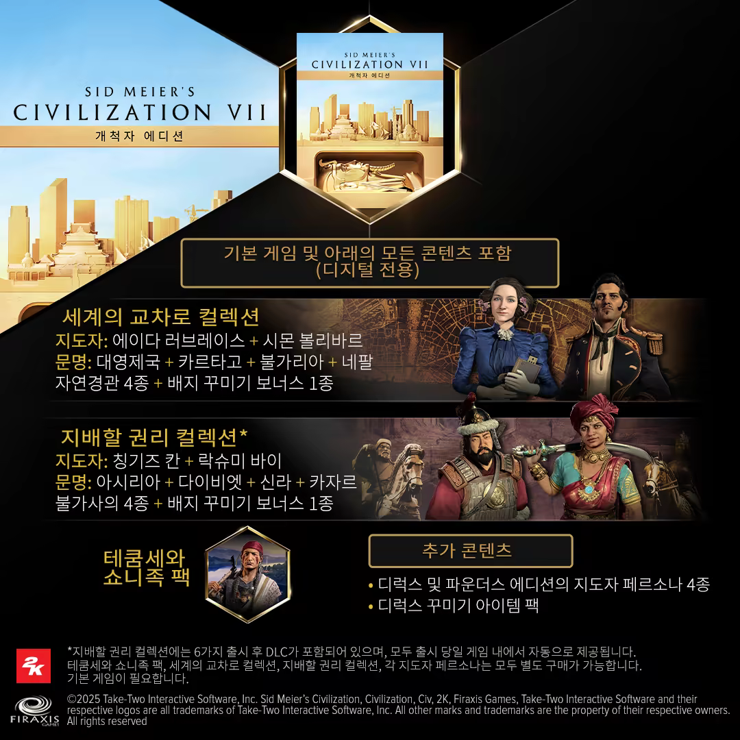 시드 마이어의 문명 VII 개척자 에디션은 방대한 추가 콘텐츠를 통해 문명을 처음 접하는 플레이어가 역사를 가로지르는 여정을 시작하기에 완벽한 출발점을 제공합니다. 시드 마이어의 문명 VII 스탠다드 또는 디럭스 에디션을 보유 중이라면, 개척자 에디션에 포함된 DLC를 개별 구매하실 수 있습니다.