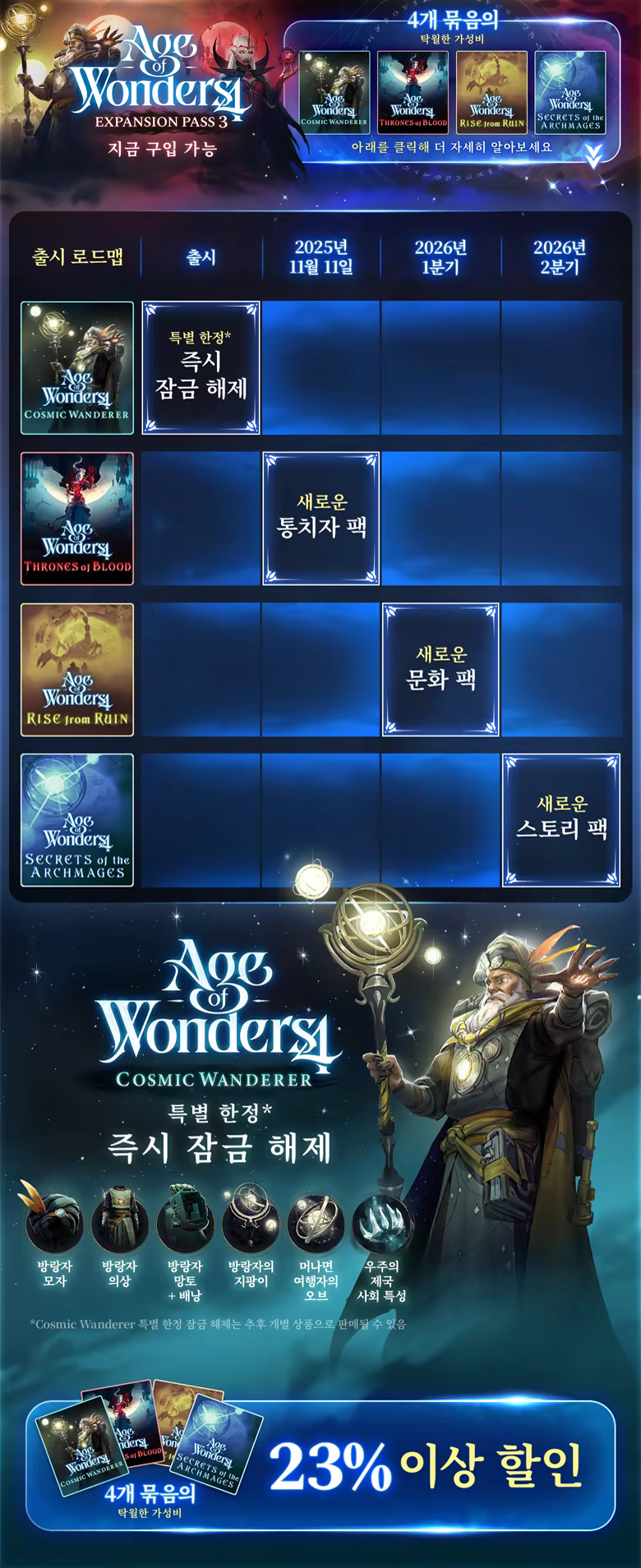 - 헤아릴 수 없이 많은 제국, 유닛, 배경 설정을 이용해 매번 새롭게 플레이할 수 있으며, Age of Wonders 시리즈 중 가장 많은 모드와 자유로운 플레이도 준비되어 있습니다.